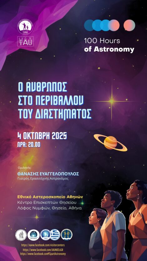 * Η εκδήλωση πραγματοποιείται στο πλαίσιο του προγράμματος #100HoursofAstronomy της Διεθνούς Αστρονομικής Ένωσης (The International Astronomical Union) σε συνεργασία με την Αστρονομική Ένωση Σπάρτης